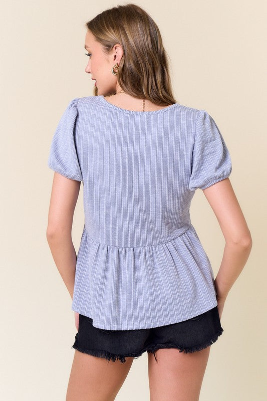 Slub Ribbed V-Neck Puff Short Sleeve Babydoll Top